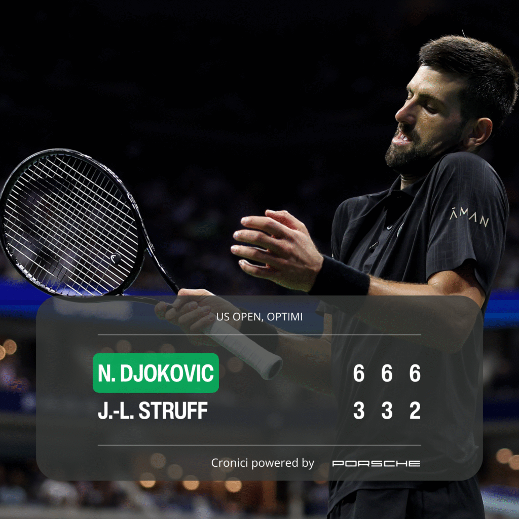 Neamțul de 35 de ani, în tinerețe fost sparring-partner al sârbului, pregătește aria căreia i se mai spune și cântec de lebădă. După o perioadă garnisită de accidentări, Struff a venit cu chef de tenis la Flushing Meadows și, de la prima rundă a calificărilor până în optimi, a scos pe margine șase flăcăi. Printre ei, doi favoriți cerți, Rune și Tiafoe. Nu avea așteptări să-l păcălească și pe Nole, în conferința de presă dinaintea meciului vorbise doar despre marele campion all-time. Doar la superlativ, arătând la nivel subliminal cât de onorat este să-și facă bagajele din cauza Djokerului.