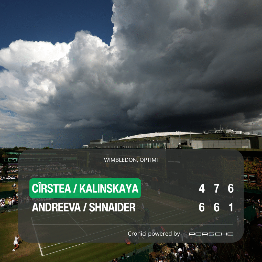 Mai era acolo, totuși, un ingredient aparent benign. Anna și Sorana se distrau de minune, bătălia era un “having fun” continuu, chiar și la 5-6 în manșa secundă. Astfel, cu o relaxare care le-a adus până aici în turneu, au făcut 5-0 în tie-break și au închis cu 7-3, apoi, după nici măcar un game, au trecut iarăși la dos din cauza torenților. Revenite pe iarba verde, cu același puls și aceeași degajare, Cîrstea și Kalinskaya au anulat competiția în decisiv. 6-1, cu execuții de ca și cum ar fi de o viață în această formulă. Și vor juca sferturi la Wimbledon. Not bad at all. At All England Lawn Tennis and Croquet Club.