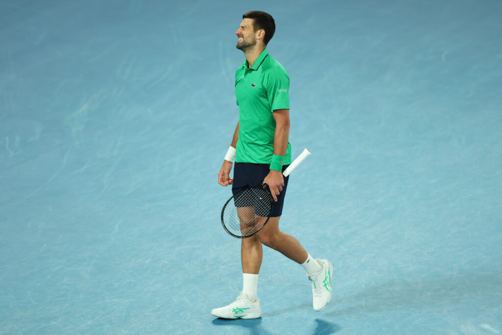 MELBOURNE, AUSTRALIA – FEBRUARY 01: Novak Djokovic of Serbia reacts in the Men’s Singles Final against Carlos Alcaraz of Spain during day 15 of the 2026 Australian Open at Melbourne Park on February 01, 2026 in Melbourne, Australia. (Photo by Lintao Zhang/Getty Images)