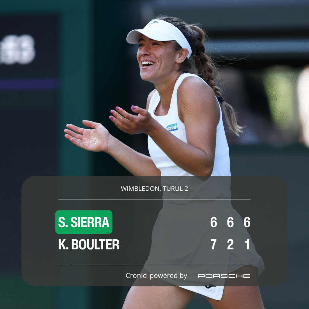 Apropo, la ea acasă, în Mar del Plata, erau minus 2 grade, deci rudele care nu i s-au deplasat în Europa cu acest prilej băgau de zor pe foc. Îi luase frigul și mai tare după o manșă întâi în care outsidera își dărâma singură castelul construit de ea însăși pe cea mai verde iarbă din tenis. A urmat, însă, una dintre cele mai uimitoare răsturnări de situație. Demagnetizată complet, britanica a fost doar martoră la un solo de rachetă din partea numitei Sierra: 6-2 și 6-1 și povestea de la All England Lawn Tennis and Croquet Club se rostogolește mai departe. Alte nopți de cazare, poate și alte all inclusive-uri, așa cum a fost meciul cu Katie.