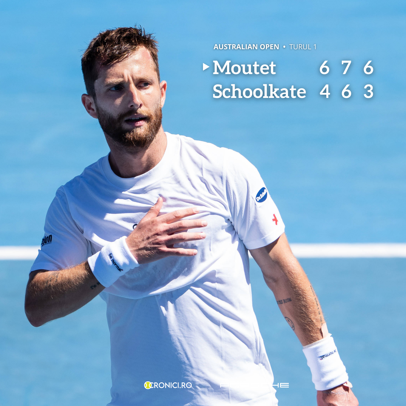 Corentin Moutet e genul de jucător care, dacă s-ar naște într-o carte de Jules Verne, ar fi băiatul ăla care strică busola și pune balena pe grătar înainte ca tot el să scoate cumva, nimeni nu știe cum, nava din furtună. Francezul a debutat la Australian Open cu un 6-4, 7-6, 6-3 în fața localnicului Tristan Schoolkate, un meci în care a bifat un întreg arsenal de demențe: pauză medicală când mai avea puțin și lua meciul, val de înjurături din tribune și un underarm serve pe minge de meci. Adică exact ce ne-am aștepta de la un om care joacă tenis de parcă ar picta pereții unei galerii contemporane în direct. Cu ketchup. Și-n loc de pensulă folosește o jumătate de croissant din care molfăie în timp ce stă agățat de tavan.