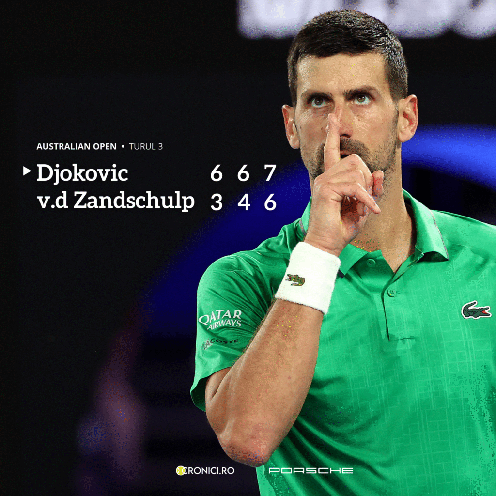 În turul al treilea la Australian Open, victima de serviciu a fost Botic van de Zandschulp, altfel băiat bun cu suflet bun, chit că numele-i sună a factură la gaze în limba olandeză. Botic a încercat, în limitele proprii, să fie relevant pe Rod Laver Arena. A avut chiar și mingi de set în setul al treilea, dar să-l bagi pe Nole în corzi și să-l ameninți cu un meci lung e ca și cum ai încerca să stingi un incendiu forestier cu o greblă. Indiferent cât te-ai chinui, nu-l faci decât să ardă mai tare.