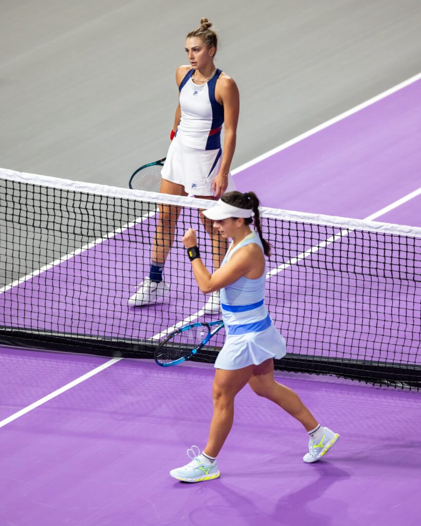 Briana Szabo și Elena Bertea, de 20, respectiv 19 ani, au avut neșansa de a întâlni în aventura lor la dublu două doamne din Taiwan și Hong Kong, ambele plecate spre 30 de ani. Româncele noastre, pentru prima dată în această formulă, asiaticele, deja sătule una de cealaltă. Din 2022 își tot verifică potențialul și – față de alte partide din circuitul dedicat întregului teren de tenis – am remarcat că ele abordează fenomenul în stil propriu. Le-am găsit adesea simultan în defensivă, sincronizându-se cu mișcări aparent studiate.