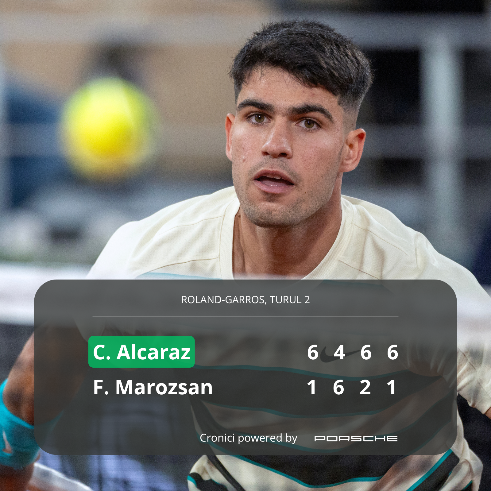 6–1, 4–6, 6–1, 6–2 a fost scorul final al partidei. Un set scăpat printre degete, urmat de două în care Marozsan n-a mai contat decât pentru că era obligatoriu ca pe tabela de scor să fie doi jucători. Spaniolul a avut 41 de lovituri direct câștigătoare, a pierdut doar 25 de puncte pe greșeli neforțate, și-a creat o grămadă de mingi de break, din care a transformat destule cât să-l trimită pe ungur la vestiare fără glorie, dar cu experiență. Alcaraz i-a făcut maghiarului un tur complet prin corzile terenului, i-a luat mingile de break din farfurie și l-a ținut la respect cu un tenis în care forța pare că zâmbește înainte să se exprime.