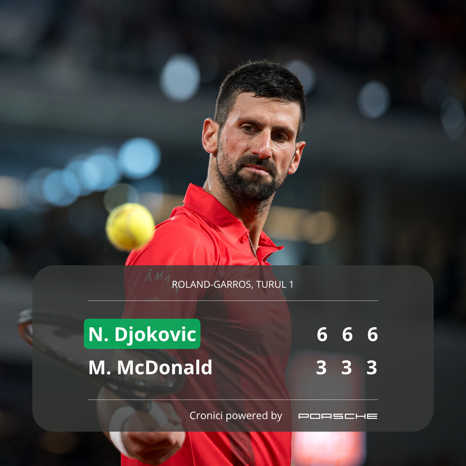 E greu să mai percepi ce e performanță din ceea ce face Nole. A câștigat în turul 1 cu Mackenzie McDonald un meci care putea să nu se joace, sârbul să primească în cameră victoria, și americanul cu siguranță nu s-ar fi supărat prea tare. Măcar ar fi scăpat de spălat echipamentul și de ieșit din hotel prin traficul parizian.