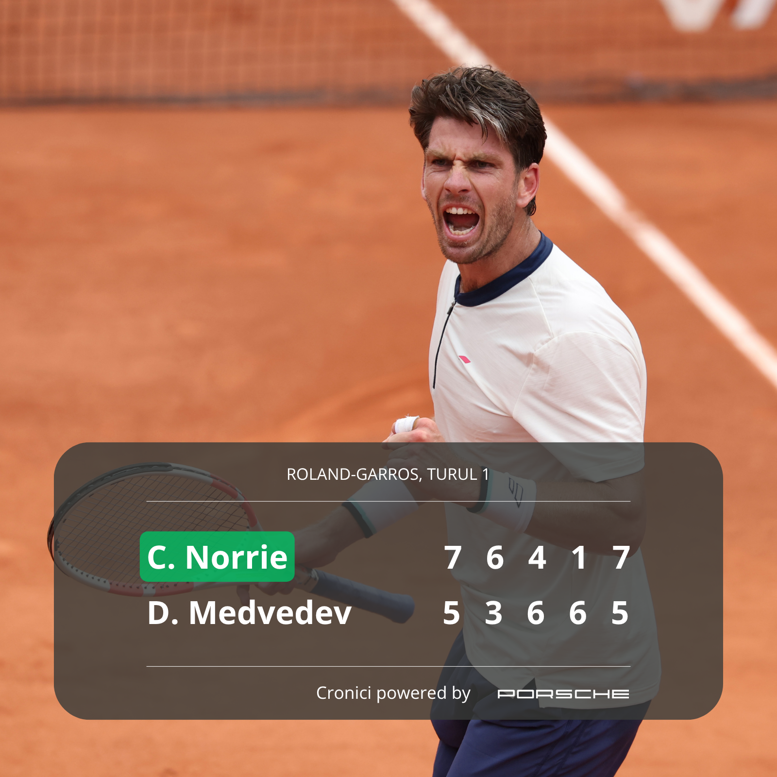La 5-4, Daniil și-a pierdut game-ul de serviciu care-i putea asigura încă două zile de servicii hoteliere cu amabilitate franțuzească, iar de-acolo Norrie a știut cum să rezolve ecuația: game lipit de încă un break făcut din sudoare și presiune nucleară pe un creier al adversarului care uitase deja pași de tango și țopăia frenetic și psihotic. Adică starea lui Medvedev de la cafeaua de dimineață și până la paharul de lăptic de seară.