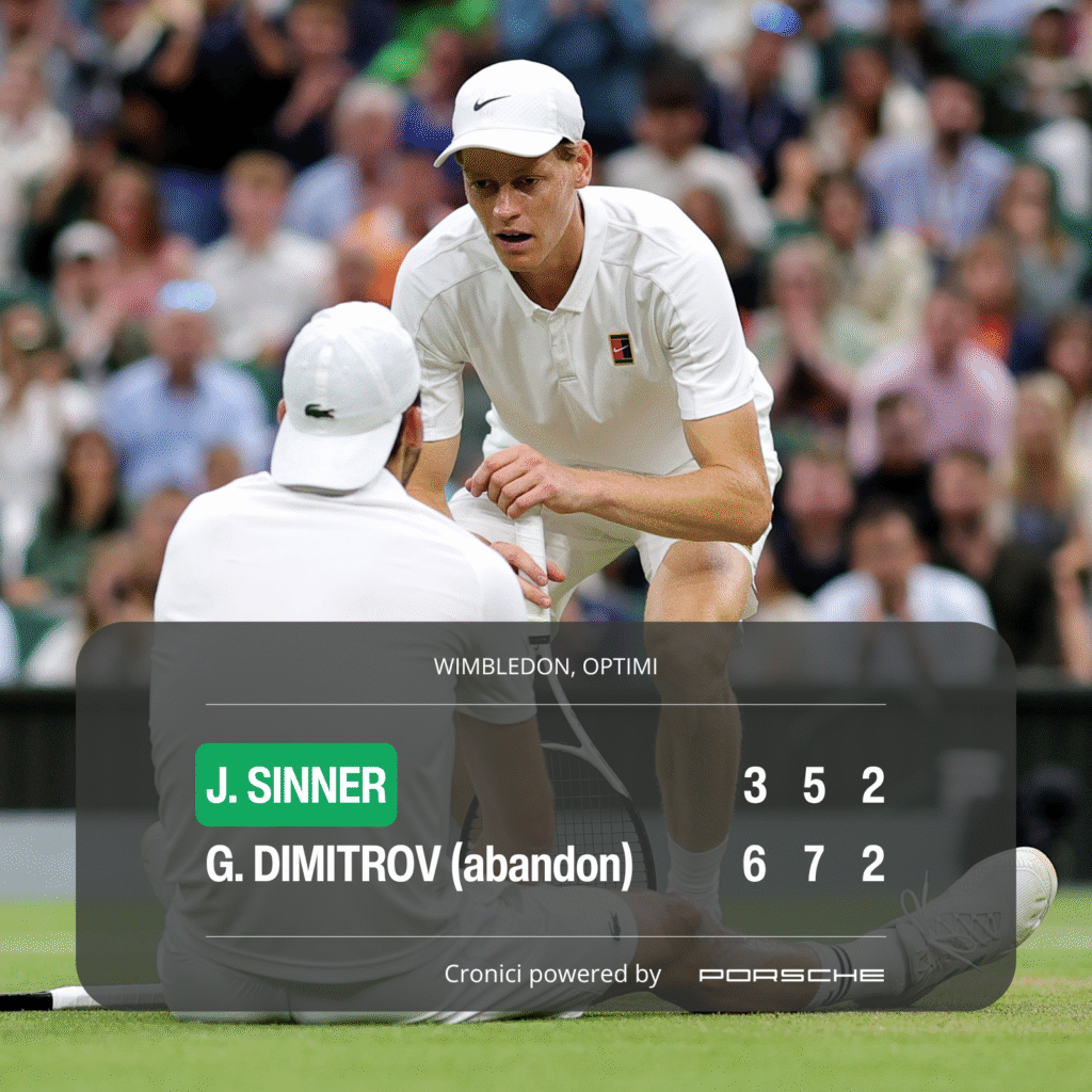 Motivul scorului n-are legătură cu sportul, ci cu faptul că, aparent, Sinner și-a ciobit ceva la brațul drept în chiar primul game al meciului, când a încercat să se-ntindă după o minge și a căzut de la înalțimea celor 6 metri ai săi – sau cât o mai avea azi, că e mereu în creștere pe toate axele – pe mână.