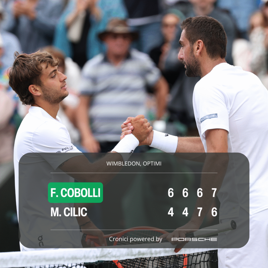 După patru seturi echilibrate cât a putut să le țină Cilic din mușchi, Cobolli l-a trimis azi pe Marin înapoi în vremurile de glorie din care-a revenit. Dacă la Paris, acum o lună, italianul îl dezbrăcase de iluzii pe croat în trei seturi cât trei espresso-uri scurte, ba chiar unul cât un ristretto (6-2, 6-1, 6-3), de data asta meciul a semănat mai mult cu un cappuccino în care s-a turnat cam mult lapte: 6-4, 6-4, 6-7(4), 7-6(3). Ne așteptam la această diferență, însă, doar Cilic scarpină The Shard în vârful creștetului, deci e construit pentru a profita de alunecarea mingii pe firul de iarbă.